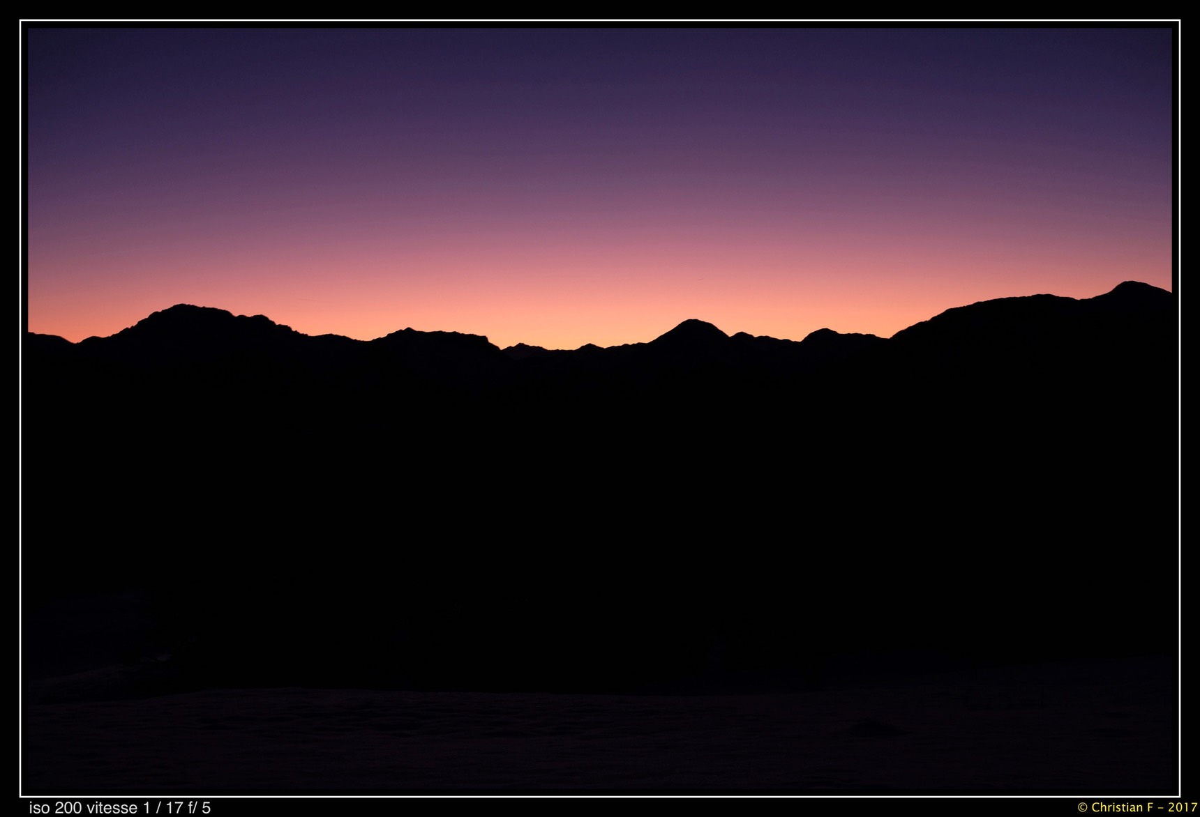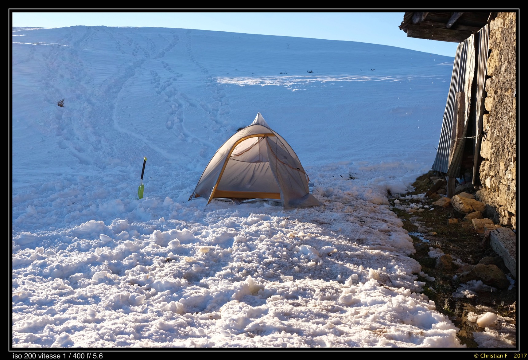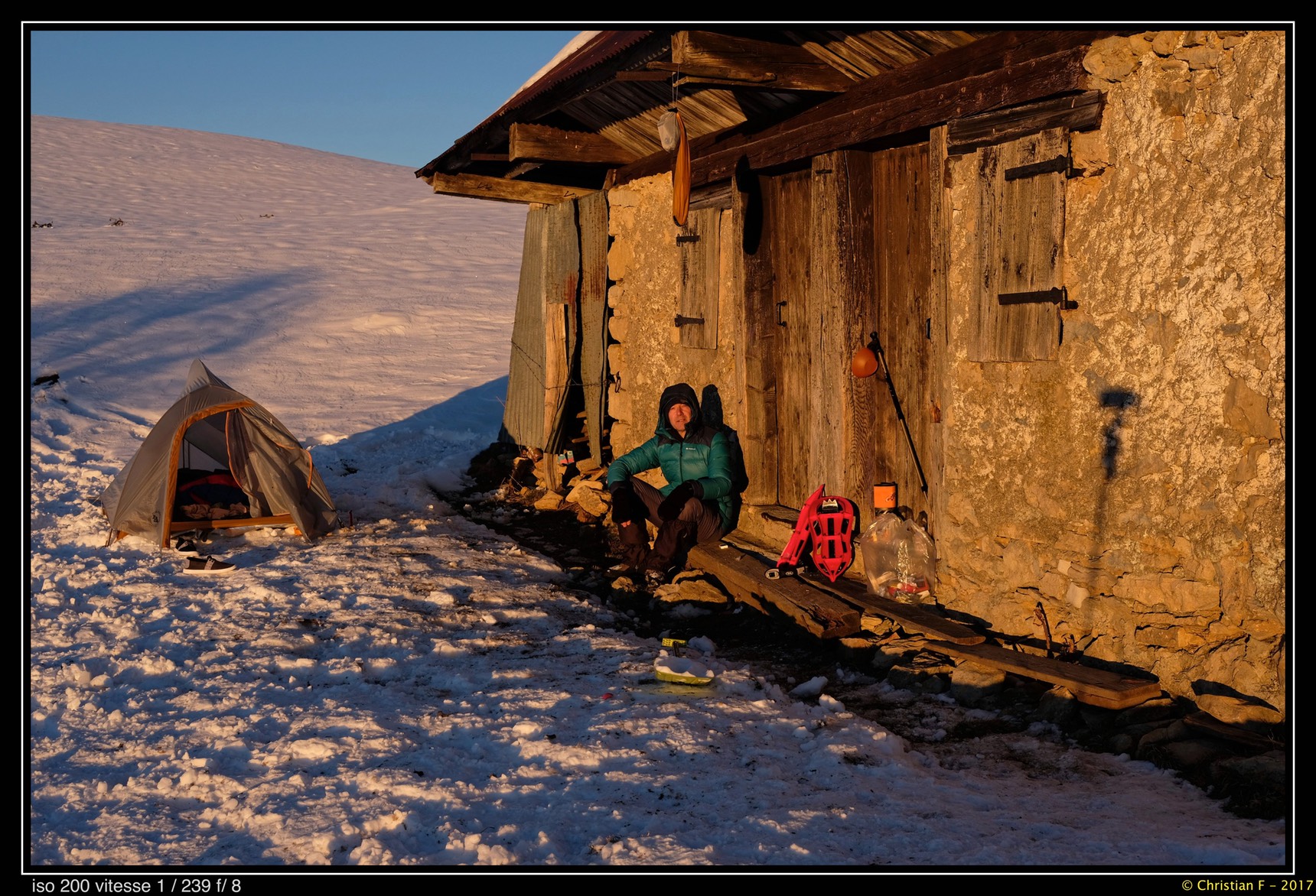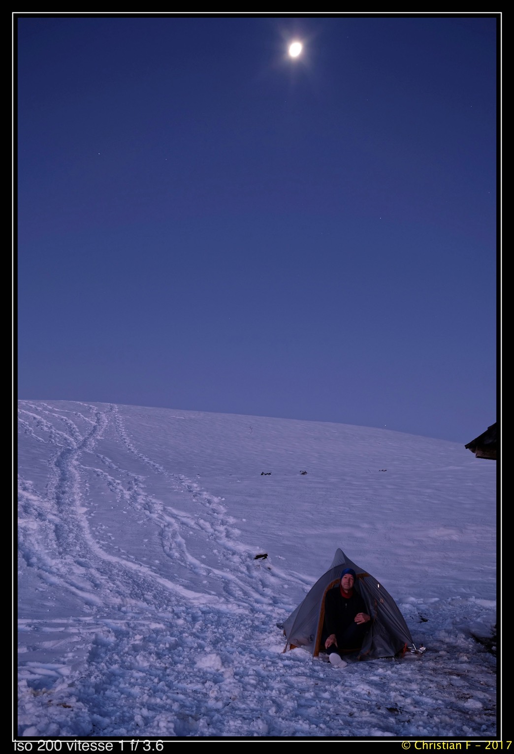 Dès le couché du soleil, le température descend à -7°. Le repas avalé, je me glisse dans la tente et duvet. Au petit matin (-5°) la pleine Lune offre une douce luminosité avant l’arrivée du soleil.